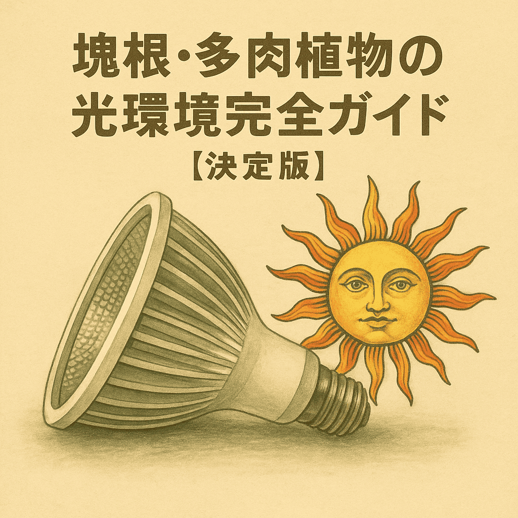 塊根・多肉の徒長を防ぐ光量と光質の基本を、PPFD・DLI・波長の順に整理しました。まずはこちらの「光環境完全ガイド【決定版】」で全体像を掴み、必要な章へ進んでください。