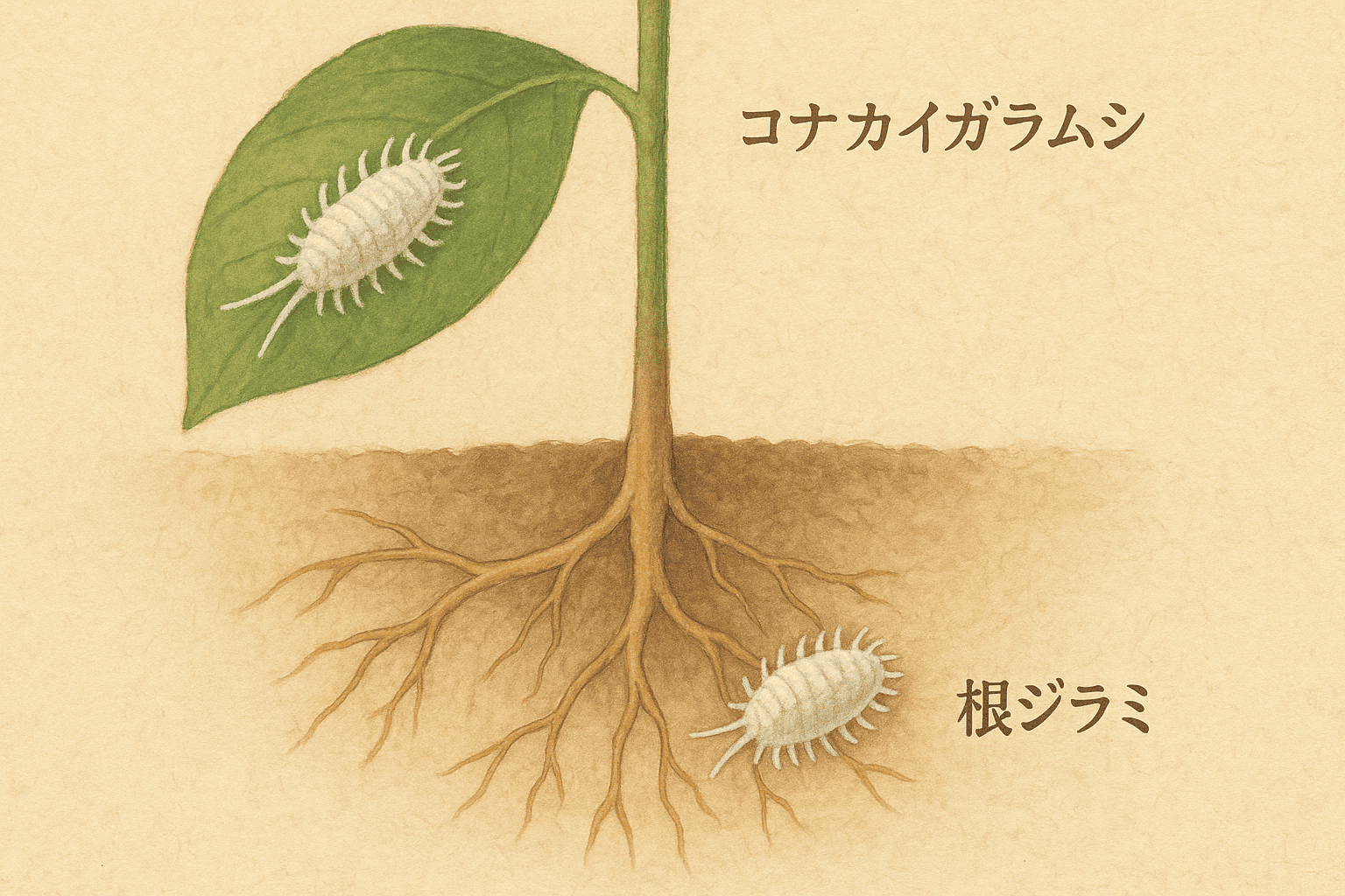 同じ「カイガラムシ」と呼ばれる仲間でも、コナカイガラムシ根ジラミ(根部カイガラムシ)は発生する場所も対処法もまったく異なります。前者は葉や茎など地上部に白い綿状のロウをまとって現れ、風通しの悪い室内や葉腋のすき間で繁殖します。一方、根ジラミは土の中の根表面に寄生し、見えないまま養分を吸い取って株を衰弱させる「地下の害虫」です。コナカイガラムシはブラッシングやアルコール綿棒など物理的な拭き取りが主な対策ですが、根ジラミは発見後に鉢を抜いて洗根・用土交換が必要になります。いずれも「弱った株」に集中するため、日頃から清潔で通気性の高い環境と健全な根張りを保つことが最大の予防策です。見える敵(コナカイガラムシ)と見えない敵(根ジラミ)──どちらも塊根植物・多肉植物を長く育てる上で無視できない存在です。