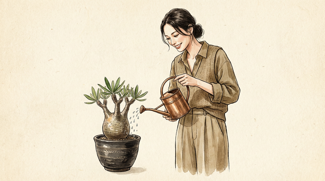 肥料は、発根直後には基本的に不要です。発根の初期段階では、根が水とごく少量のミネラルを吸収できれば十分であり、窒素やリンを積極的に与えるフェーズではありません。少なくとも、安定して新葉が展開し、1シーズンのあいだに塊根のハリと枝の太さが増していることが確認できてから、薄めの液肥を控えめに使い始めるくらいの時間感覚が適切です(Marschner, 2012)。